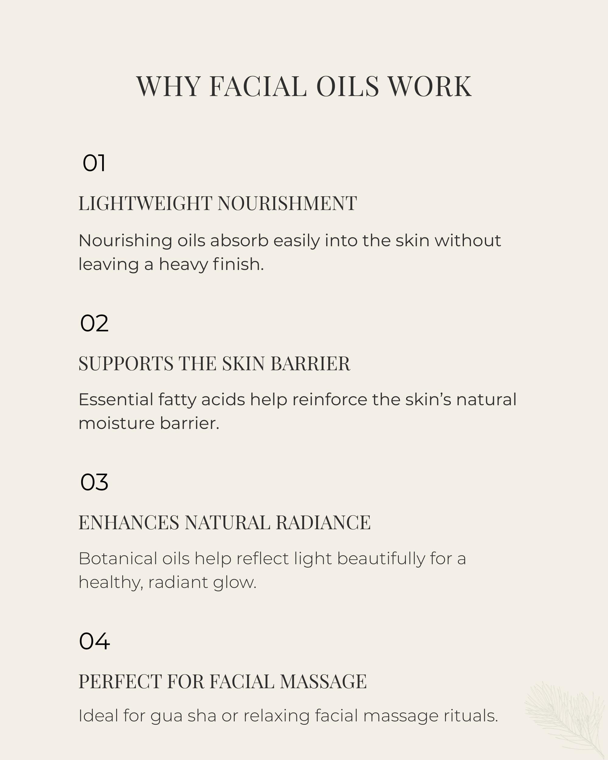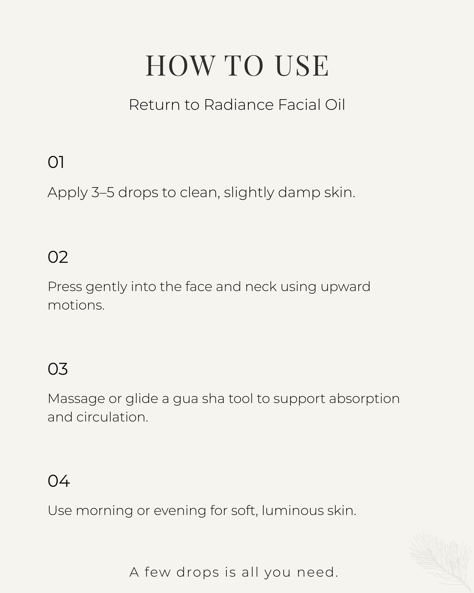 Return to Radiance is a meticulously layered natural face oil designed to restore luminosity, elasticity, and softness with a refined, weightless finish.