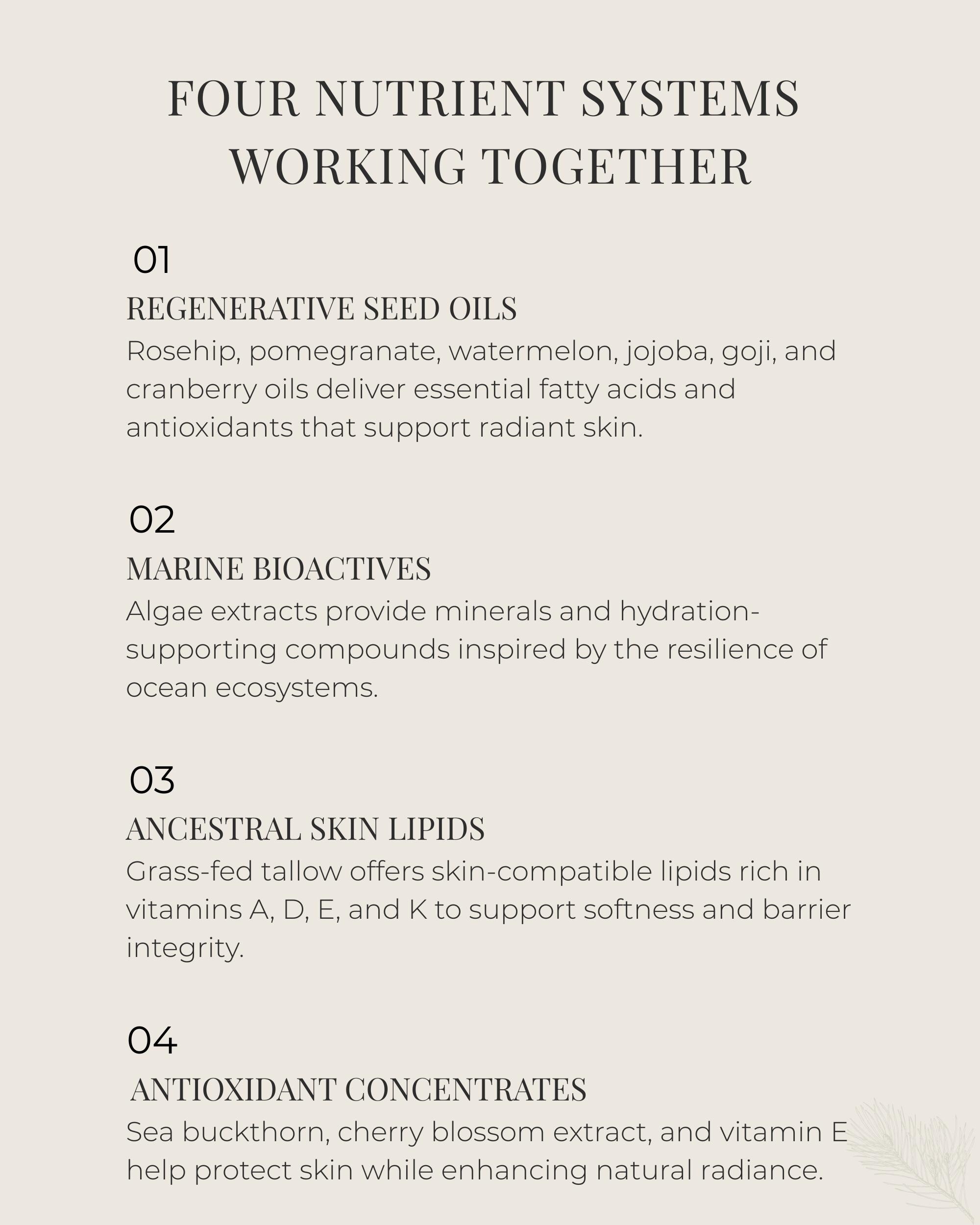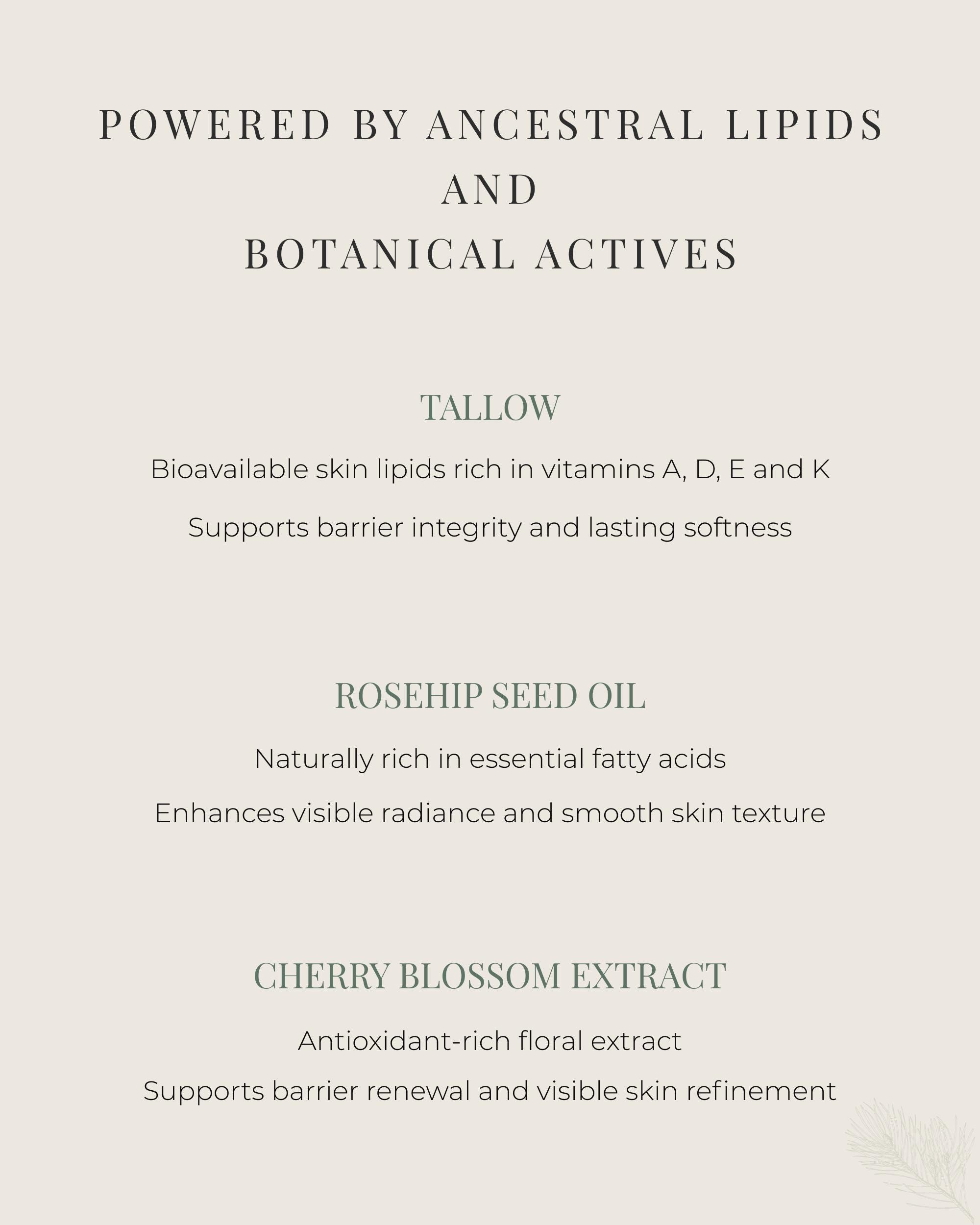 Crafted in small batches, this formula blends ancestral tallow with antioxidant-dense botanical oils and advanced algae extracts to support the skin barrier while encouraging visible glow and suppleness.